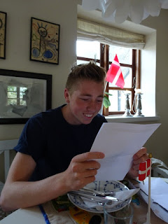 Og her er så gaven ........ Knallertkortet har han ikke fået endnu. Da kørerprøven skulle tages, var han til springopvisning i Sverige.